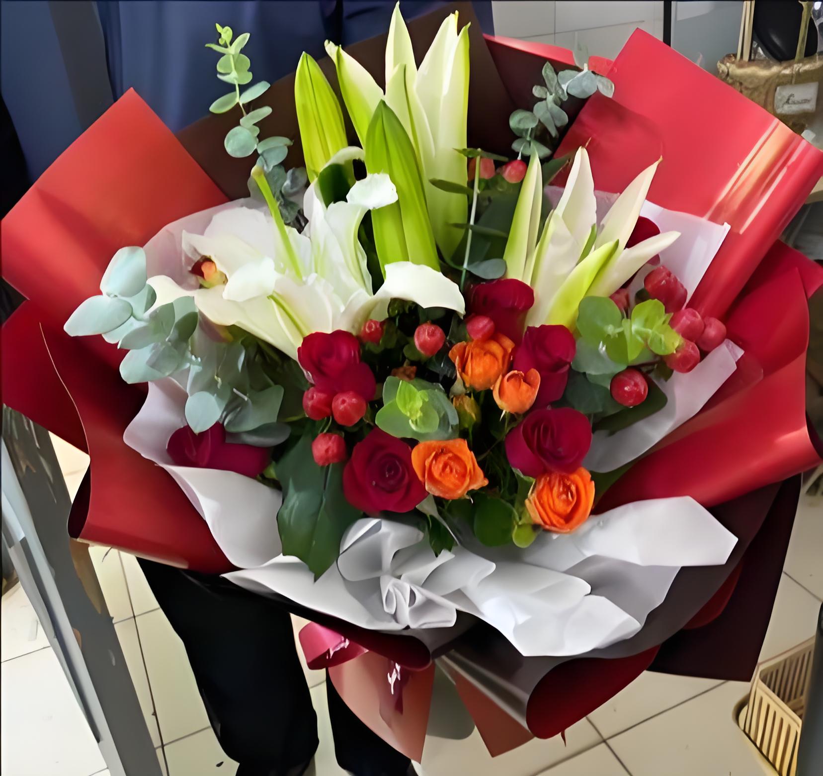 深圳罗湖区花店包11枝红玫瑰、2枝多头白百合、6枝橙色多头玫瑰、红豆、尤加利叶